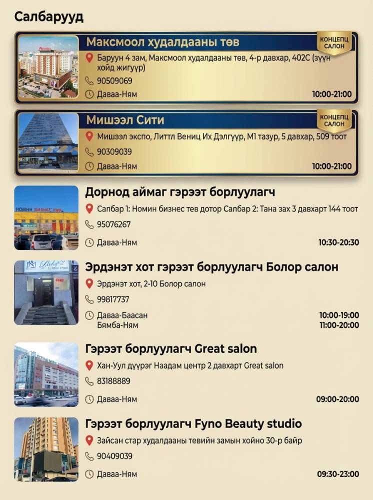 Салон 1: 📍Мишээл экспо, M1 тауэр , 5-р давхар, 509 тоот
